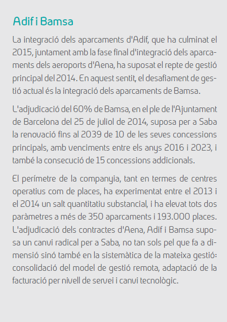 Saba s’ha mantingut fidel al llarg del 2014 als seus tres eixosd’actuació: eficiència, reconversió comercial i creixement.L’exercici 2014 s’ha caracteritzat pel canvi de perímetre experimentat per la unitat de negoci d’aparcaments, gràcies a l’adjudicació dels contractes d’Adif i Bamsa, la desinversió en els parcs logístics de Madrid i el Penedès, i pel refinançament del deute, amb impacte en les societats d’aparcaments de Saba que operen a la Unió Europea.